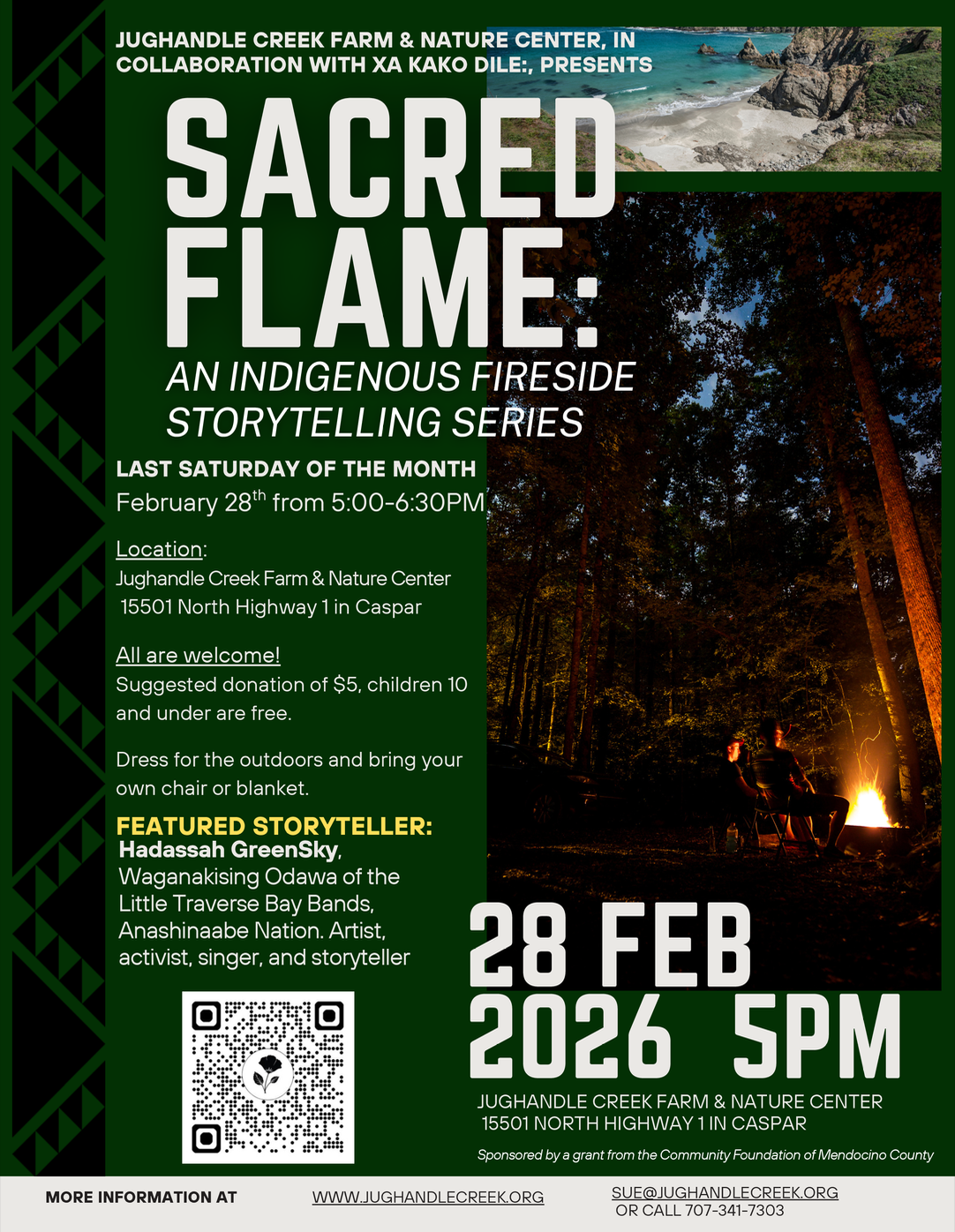 This event is offered the last Sunday of each month. Please join us in gathering around the fire to listen, to learn, and connect through the rich tradition of Indigenous storytelling.